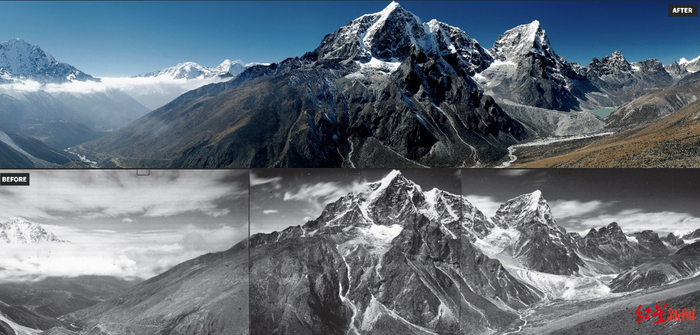 ↑图为塔波切峰在2007年(上)和1950年代(下)同一角度的对比。其下方是通往珠峰大本营的必经之路。全球变暖趋势导致位于塔波切峰下方的清洁非碎片冰川的面积大大萎缩。ICIMOD供图