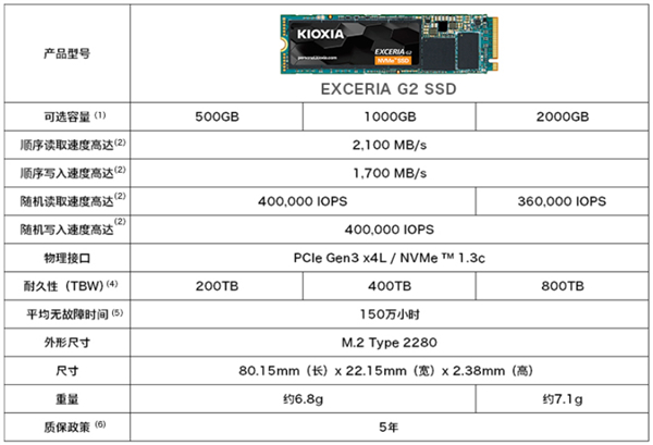 RC20基于铠侠96层堆栈的TLC闪存,PCIe 3.0 x4通道,读取速度2100MB/s,写入速度1700MB/s,随机读取40K IOPS,随机写入40K IOPS,400TBW寿命(2TB为800TBW),MTTF无故障间隔150万小时,功耗3.5W,质保5年。