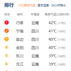 红星新闻记者注意到,5月29日,宁南的气温已突破41℃,在全国前十高热榜中位居第二。5月30日,凉山州内金沙江和雅砻江河谷的部分低海拔地带的最高气温将超过42℃。5月29日,攀枝花仁和区多个乡镇低海拔地区最高气温均超过40℃,预计未来3-5天依然超过40℃。