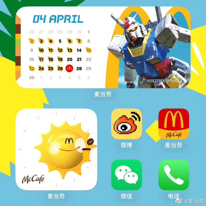 本次联名以最经典的元祖RX-78-2高达为核心,携手推出包括限量高达实体卡牌、合作主题包装,如以元祖高达的经典形象为灵感而设计的巨无霸汉堡盒、饮料纸杯、餐盘垫纸等。其中也包括与线下高达主题餐厅等合作项目。50座高达立像会走进全国指定麦当劳高达主题餐厅,活动将一直持续到五月下旬,意在为粉丝营造全感官的用餐体验。