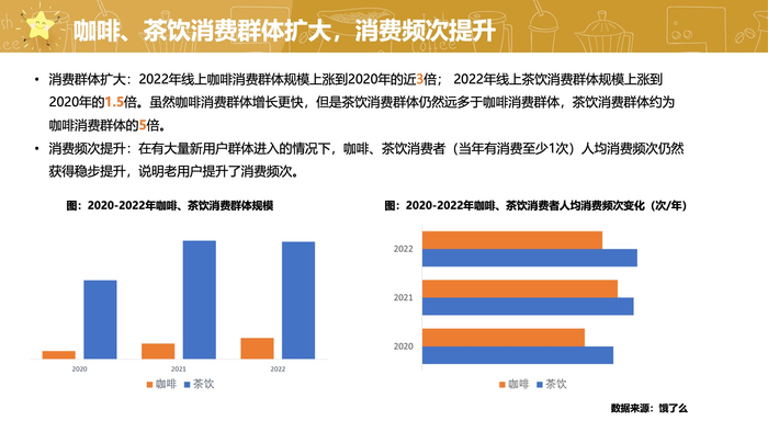 报告显示,茶饮和咖啡市场都呈现出快速增长的趋势,在线上消费领域的复合增速分别达到30%和60%,其中订单规模方面,茶饮是咖啡的6倍多,消费规模方面,茶饮是咖啡的4倍多。