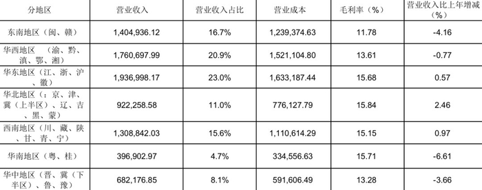 2022年永辉超市营收区域分布及毛利率水平 制表:乾行