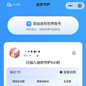 值得肯定的是,除了头部厂商,中游游戏厂商也开始重视家长平台的重要性。如迷你玩便针对旗下游戏《迷你世界》设计了“迷你守护”小程序,当绑定迷你世界账号后,便可通过该小程序得知孩子的游戏总次数、总时长、总充值等数据,并可对孩子的游戏行为作出限制。