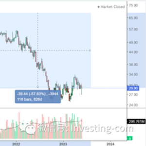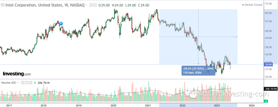英特尔Intel(NASDAQ:INTC)较2022年熊市前的高点已经下跌了58%左右,市值降至了1,201亿美元。