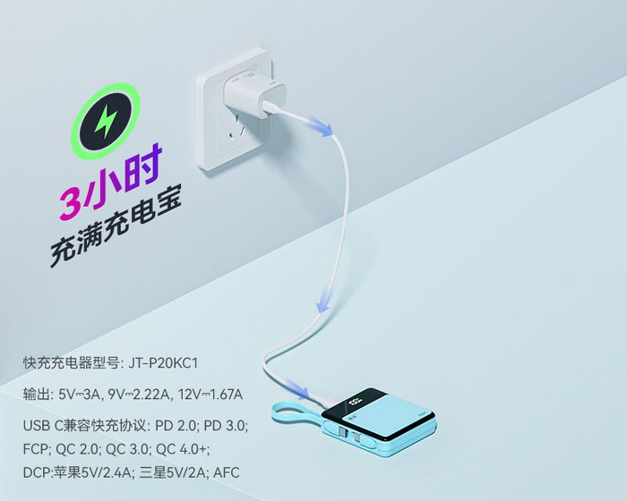 充电宝不仅容量强大,而且轻盈易携,给您带来更便捷的充电体验。充电宝自配手提线,便于携带和使用。借助自带线的设计,插拔方便,省去了繁琐的线材携带问题,让您的充电体验更加便捷。