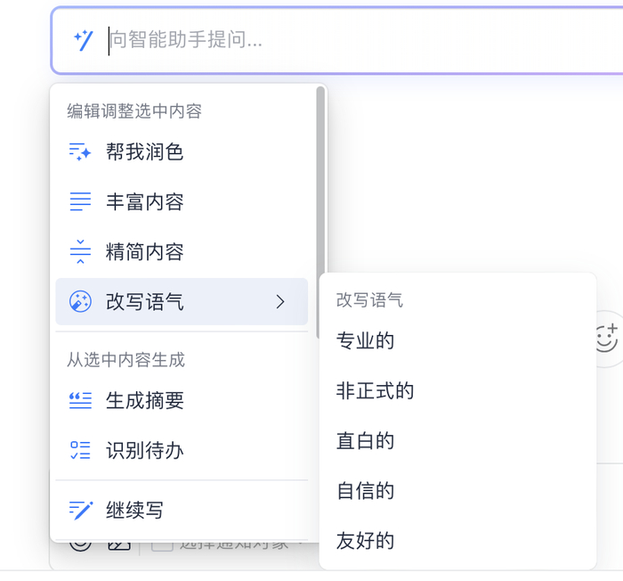 如果感觉文字不行,还可以选中文字,下方的菜单出现「帮我润色」、「丰富内容」、「精简内容」和改写语气等选项。