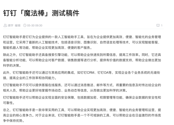 虽然不太好直接变成稿子发在网站上,但如果是一些事实性的段新闻,或者是新闻稿,直接用钉钉智能助手来生成,未尝不是一个高效的选择。