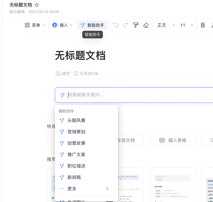 笔者上述使用场景,相对还是比较割裂,但如果用户操作的是更事务性的文档,例如脑暴方案或者宣传文档,智能助手的帮助会更连贯,你可以边写,边让智能助手润色、扩写或者精简,并且行文中随时添加合适的图片,涉及到同事沟通,也可以让「斜杆」提醒相关同事。