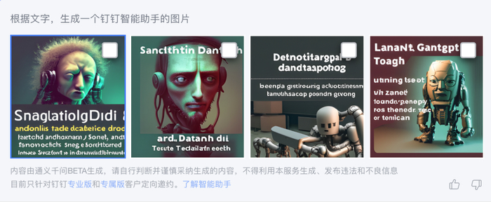 提示「/」不需要根据文字,直接生成一张钉钉 AI 的图片,这次结果就好了很多: