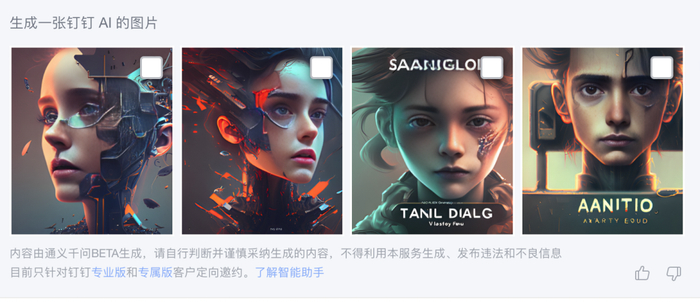 感觉直接用在文章里也不会觉得特别突兀,还挺有艺术感。这也让钉钉成为国内首个将文生图能力落地到办公场景的生产力工具。