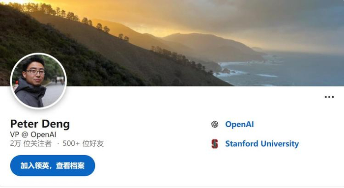 据领英页面显示,硅谷知名产品经理 Peter Deng 现已加盟 OpenAI,担任消费产品副总裁一职。