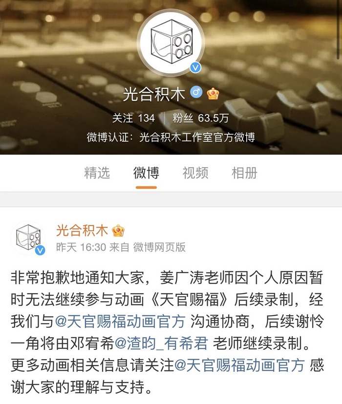 6月7日,光合积木工作室官方微博发文表示,配音演员姜广涛“因个人原因暂时无法继续参与动画《天官赐福》后续录制”,后续“谢怜”一角将由邓宥希继续录制。