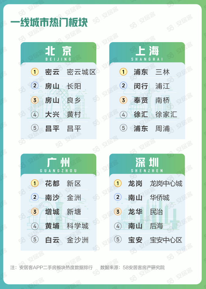 热门板块方面,北京密云、长阳、良乡、黄村和昌平;上海三林、浦江、南桥、徐家汇和周浦;广州新区、金洲、新塘、科学城和金沙洲以及深圳龙岗中心城、华侨城、民治、后海和宝安中心区受到购房者的一致青睐。