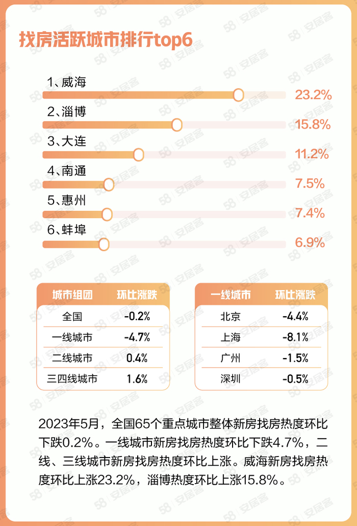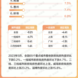 58同城、安居客发布2023年《5月国民安居指数报告》。报告显示,2023年5月,全国重点监测65城新房线上均价为17726元/㎡,环比上涨0.08%,有24城新房价格环比上涨,二三线城市找房热度环比上涨,淄博找房热度环比上涨15.8%。65城二手房挂牌均价为16560元/㎡,环比微跌0.58%,其中有12城二手房挂牌均价呈现环比上涨趋势。