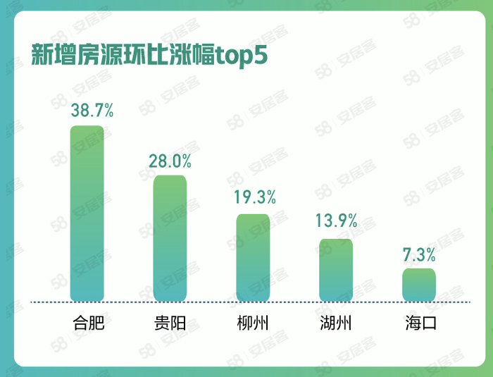 5月份全国新增挂牌房源量环比下跌7.6%。从全国范围来看,合肥新增挂牌量环比上涨38.7%、贵阳环比上涨28.0%,柳州、湖州、海口等城市均出现了涨幅不等的上涨形势。