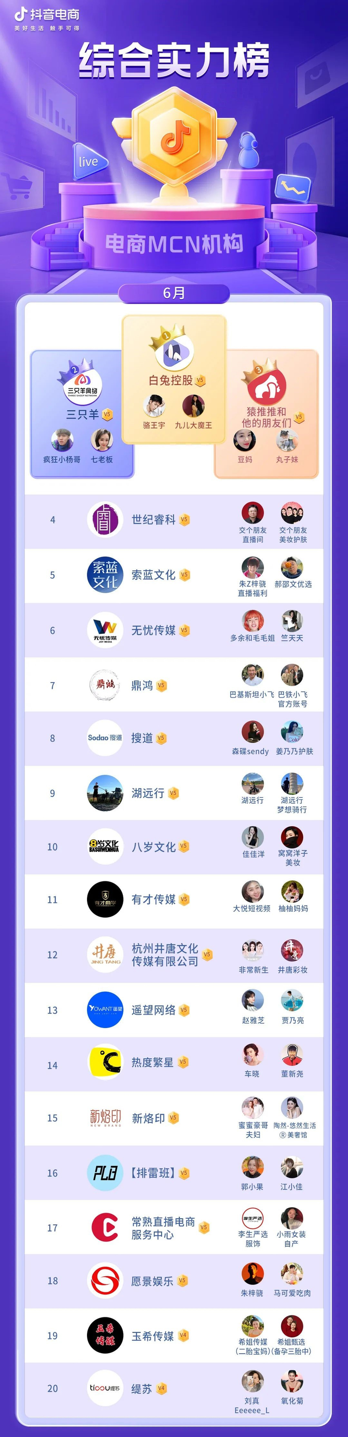 位列抖音电商MCN机构6月综合实力榜前10的分别是白兔控股、三只羊、猿推推和他的朋友们、世纪睿科、索蓝文化、无忧传媒、鼎鸿、搜道、湖远行、八岁文化。位列抖音电商MCN机构6月全域增长榜前10的分别是抖伽传媒、云星紫晨、逸胜文化、衍禾专选、蝌蚪文创直播基地、银色大地、南京小灿灿网络科技有限公司、壹元文化、有孚文化、泽上传媒。(抖音电商营销观察)