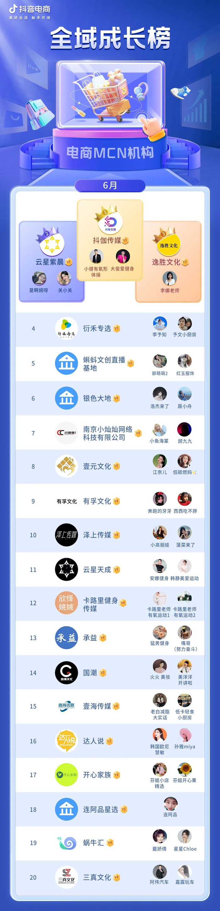 抖音电商MCN机构6月榜单公布