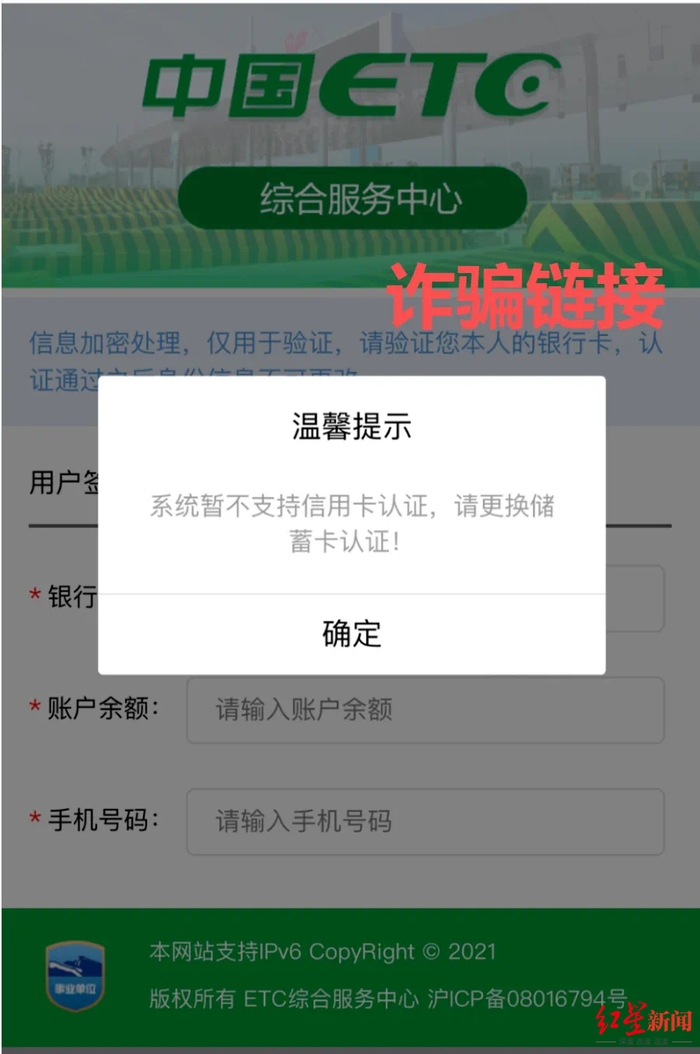 ETC服务方和银行不会向车主发送任何含有链接和需填写个人信息的短信,请大家提高警惕,切勿上当!