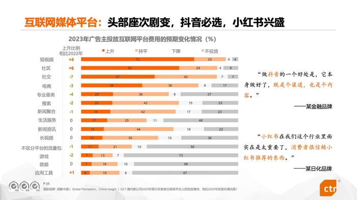 ● 互联网媒体平台头部座次剧变。短视频和社区成为广告主增投的两大主要平台,其中抖音、小红书在深访中屡被提及,成为广告主数字营销的重要阵地。