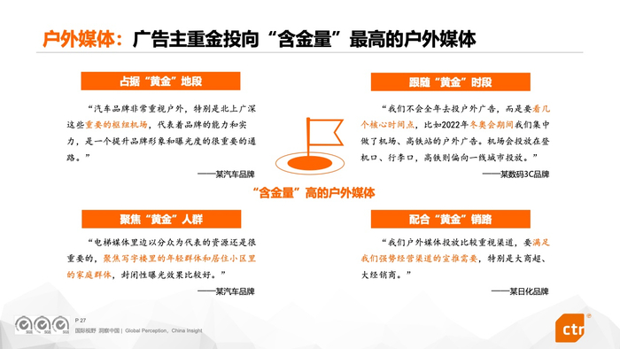 ● 广告主重金投向“含金量”最高的户外媒体。在广告主眼中,“黄金”户外媒体的特征是:占据“黄金”地段、聚焦“黄金”人群、跟随“黄金”时段和配合“黄金”销路。