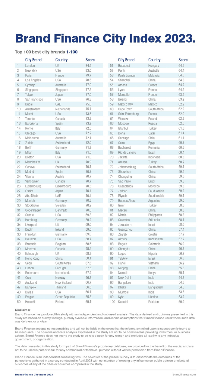 Brand Finance:2023年全球百强城市榜