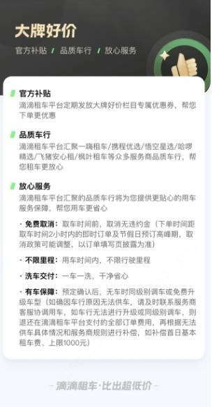 滴滴租车“大牌好价”栏目为用户提供多项服务保障