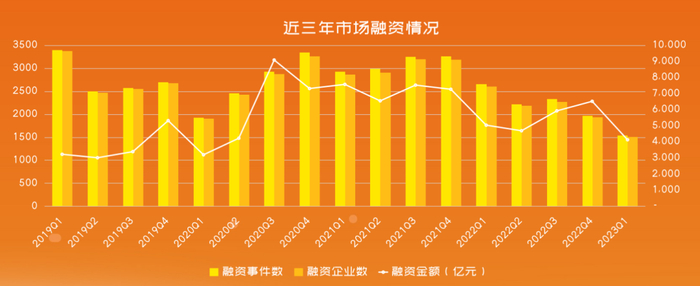 从第一张图我们能够清晰的看到,近三年整个市场的融资情况,不管是从我们的融资的事件数上,还是融资的企业数量,以及融资金额上都呈现了一个下降的一个趋势。近两年尤其是22年Q4和23年Q1,这种下降的趋势更为明显。