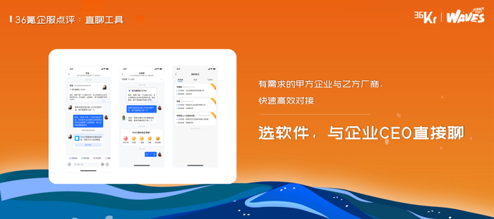 王坤介绍,36氪创投平台希望成为创新企业首选的融资平台,帮助企业预判机会、找钱、获得全网曝光以及对接产业资源。36氪企服点评则定位于帮助企业更高效“选软件”,平台提供在用趋势、口碑产品名册、案例库、专家团等功能,助力企业用数字化提升效率,此外,方便对接供需双方,“选软件,与企业CEO直接聊”的直聊工具也即将上线。
