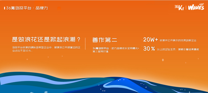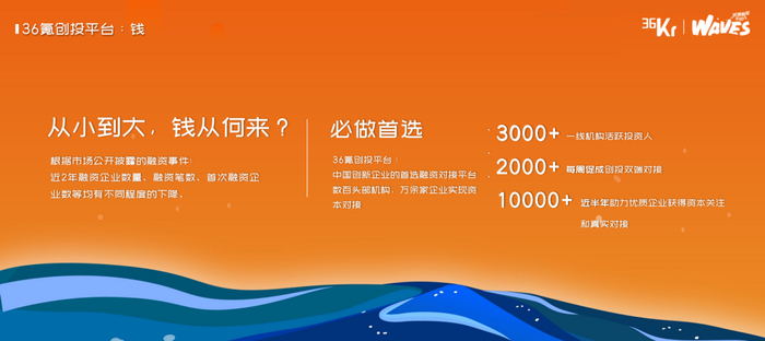 总结下来,36氪创投平台,我们当下收录了超过20w+企业,3千多一线活跃投资人,每周促成创投两端的精准对接数超过2000次;我们期望做成创新企业首选的融资平台。帮助我们的企业,预判趋势,链接资本,提升品牌力,真正把外部活水用起来。