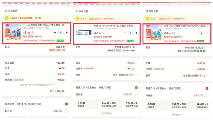 此外,同款牛奶在京东超市中售价也低过其他平台。同样是三元极致全脂纯牛奶250mlX16盒,京东超市售价为39.9元,淘宝平台上则为64.9元,一次性购买2箱单箱活动价42.2元。