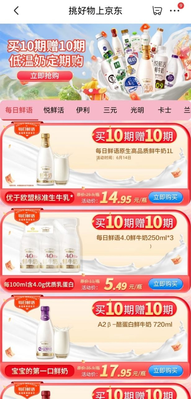 除了耐于储存的常温牛奶,近几年,低温牛奶凭借口感更香醇、营养成分和活性保留更多等特点,也深受用户喜欢。尤其一、二线的城市家庭消费者,往往更在意牛奶的安全性和营养成分。京东超市低温奶的定期购服务,则能够更好地满足消费者“少而精”的需求。
