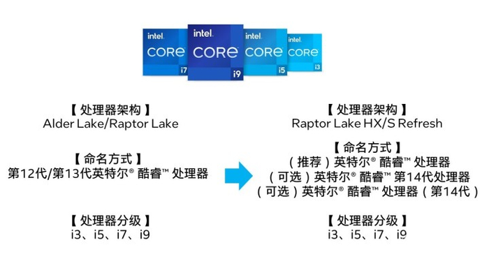 那是不是以后就没有14代了吗?并不是,基于Raptor Lake架构的HX升级款和S系列升级款仍然会使用第14代的名称。标准写法为英特尔酷睿处理器,可选用法是英特尔酷睿处理器(第14代)和英特尔酷睿第14代处理器这两种。