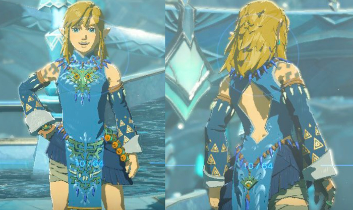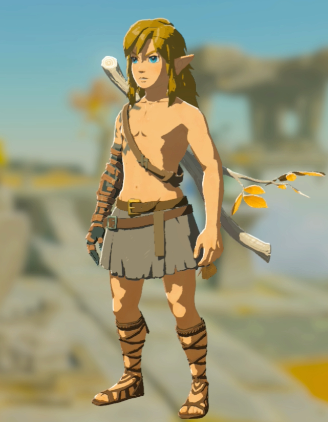 在《王国之泪》的开头,我们的主角林克失去了一切,包括他的手臂,和所有的衣物。当林克睁开眼睛时他早已衣不蔽体,这时候,任天堂给玩家准备的新手装束,是一条用皮带围起来的短裙。在接下来的几个小时里,林克都将穿着这条小短裙在初始空岛上四处乱逛,而林克的上衣则在新手教程接近结束时才会交给玩家。