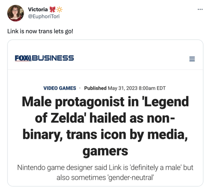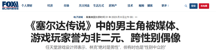 这些天关于林克性别认同的讨论也是如此。上周,外媒福克斯商业新闻(FoxBusiness)针对此事发表了一篇文章,尽管该媒体没有明确表明自己的观点,但在文末,文章作者借负面新闻暗指性少数群体的言行过激,并表示“已联系任天堂征求意见”。