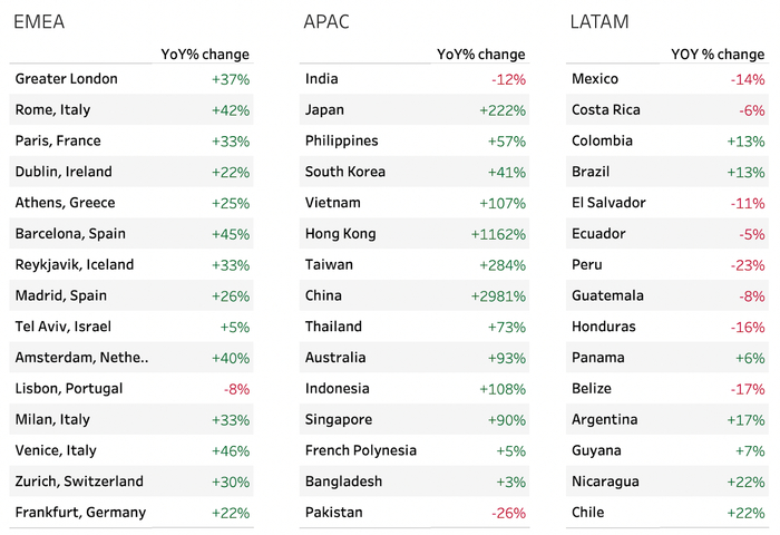 从出境游数据来看,中国吸引了大量游客,与2022年相比增长了近3000%。总体而言,夏季亚洲旅游预订量同比增长60%。今年其他热门旅游目的地包括威尼斯(意大利)、智利和尼加拉瓜,分别增长了46%、22%和22%。