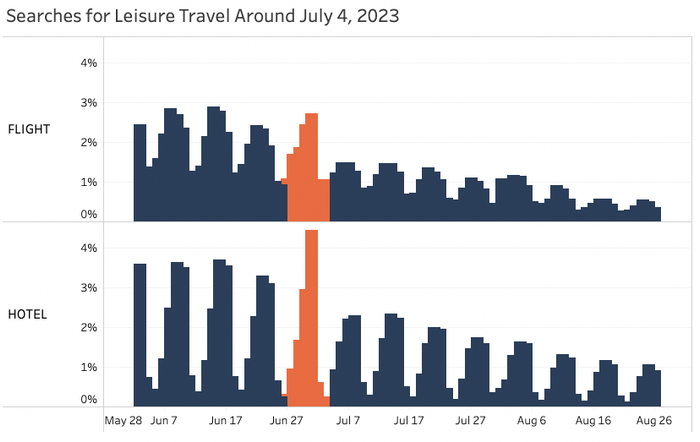 美国人喜欢在7月4日上路,今年也不例外。Sojern的数据显示,对酒店的需求在6月26日开始上升,并在假期前的周五,即6月28日达到峰值。