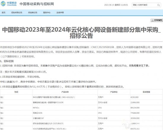 从中国移动采购与招标网获悉,日前中国移动已启动了2023年至2024年云化核心网设备新建部分集采,采购总预算为722,603万元(不含税)。如此高的预算规模,也算是今年以来金额最高的一次招标了,不知最终谁将成为大赢家?