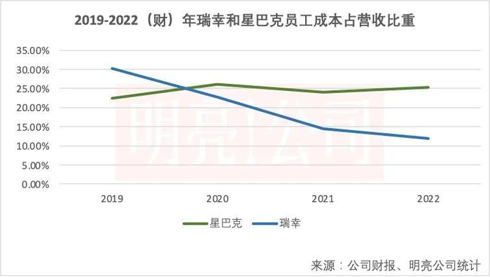 「明亮公司」统计发现,在过去的5年之中,星巴克对于伙伴的“投入”呈上升趋势,员工工资福利的成本在最新一个财季已经占净收入超1/4,2018年这数字刚刚超过1/5;而瑞幸的这一数字在2022年报中的数据比1/10略多。