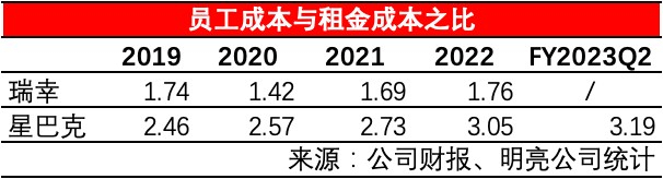 如果按照具体的比例来看,星巴克1元房租大概对应3.19元的工资,但瑞幸1元房租大概只对应1.76元的工资。