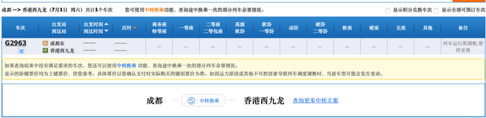 目前,成都东至香港西九龙方向的列车车票仍未开售,但已可通过12306查询到该趟车次。