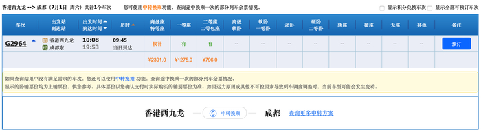 6月17日,红星新闻记者通过12306查询看到,7月1日,香港西九龙至成都东的高铁车票正式开售,跟此前公布的消息相同,二等座票价796元,全程用时9小时45分钟,列车于晚上19时53分抵达成都。