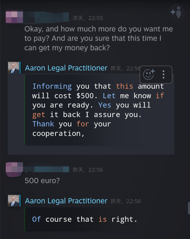 直到这个时候,我已经合计转出了 700 欧元加上 500 美元,约合人民币一万多元的款项,这一切都只是发生在短短几个小时之内。