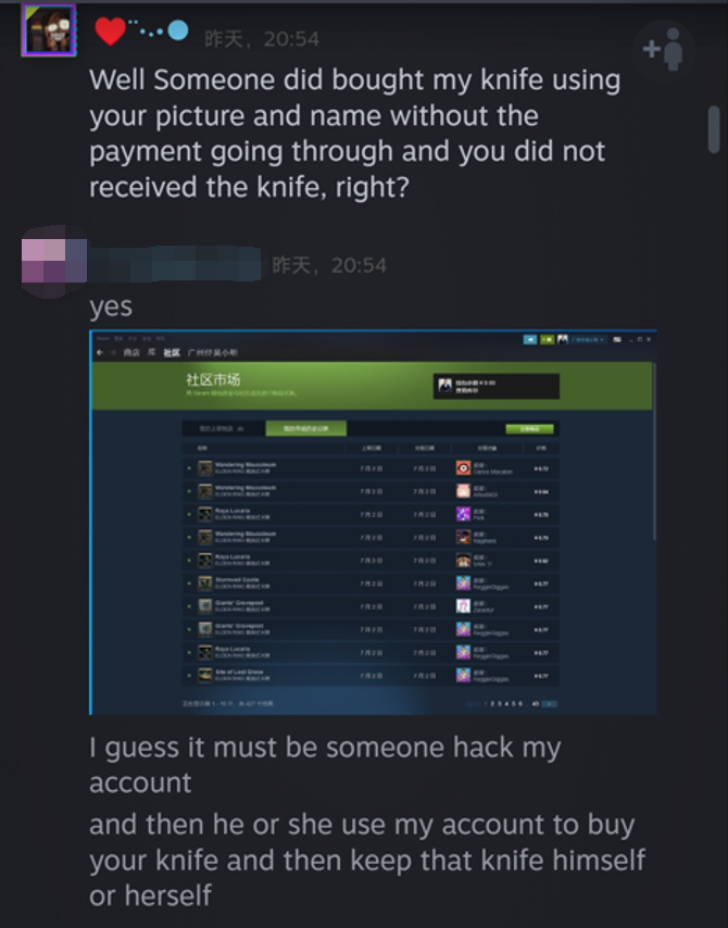 6 月 6 日晚 8 点半,我照常打开 Steam,准备开始晚上的娱乐活动。一个陌生人发来了好友邀请,并在聊天消息中指明我当前的 Steam 账号以不正当的方式在社区市场上购买了这位用户 CS:GO 里面的道具。