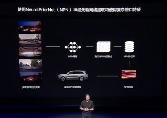 他展示了如何使用自研的神经先验网络(NPN网络)对复杂路口进行感知,结合车端感知大模型(BEV模型)和之前提取好的NPN特征,得到更稳定完整的路口结构特征。