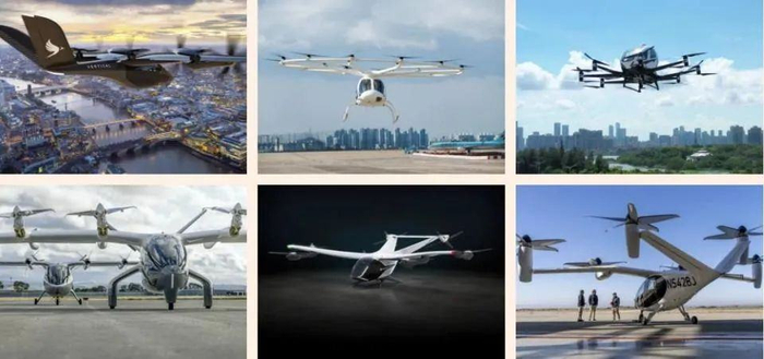 图:从左上顺时针方向依次为Vertical Aerospace的VX4、Volocopter的VoloCity、亿航的EH216-S、Joby Aviation的JAS4-1、The City Airbus NextGen和Archer Aviation的Midnight