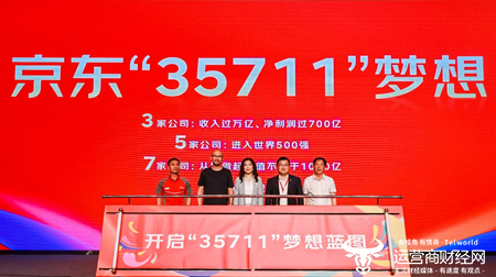 当天上午,京东向56万员工发送的《凝心聚力迈向“35711”梦想》全员信中,正式提出了面向未来20年的“35711”梦想:京东能有3家收入过万亿人民币,净利润过700亿人民币的公司;5家进入世界五百强的公司;7家从零做起市值不低于1000亿人民币的上市公司;能为国家缴纳1000亿人民币税收;提供超过100万就业岗位。