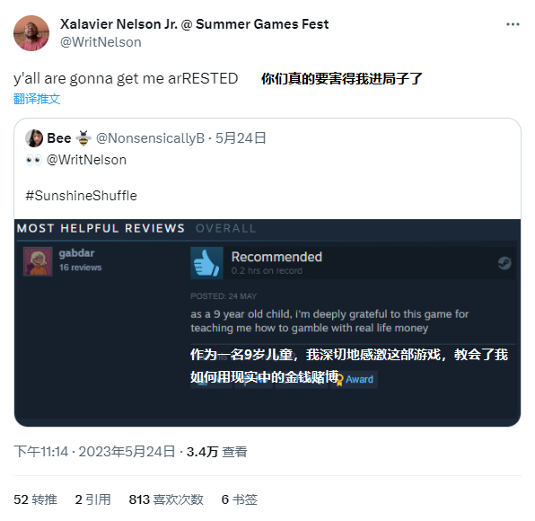仅就Steam平台数据显示,至本文截稿前,《阳光下的牌局》历史最高在线人数为52人;游戏好评率86%,但计入其中的评测只有59条。这些评测中有价值者寥寥,大多数都在附和尼尔森“鼓励儿童赌博”的梗,多少有些拱火的意思。