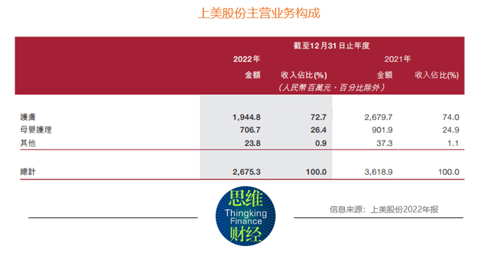 2022年年报显示,公司主营业务由护肤品、母婴护理和其他产品组成。