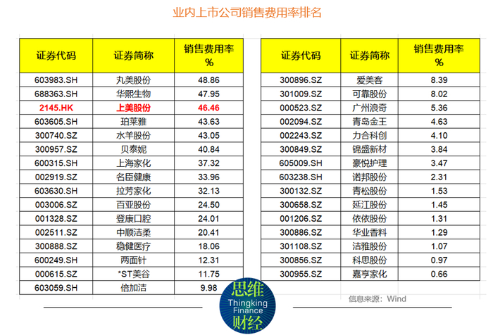 业内人士认为,营销投入较高是日化护肤行业的常态,不过,Wind数据显示,上美股份的营销投入在业内排名较为靠前(见下表)。