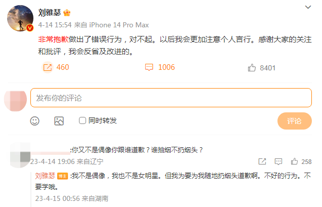 较早前,有媒体拍到演员刘雅瑟随地乱扔烟头,而且还是两次;演员乔振宇被拍到在停车场抽烟,并将烟头丢在地上踩灭……